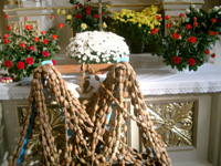 ojciec ofiarował Sanktuarium ażurową trumienkę relikwiarzową z figurką